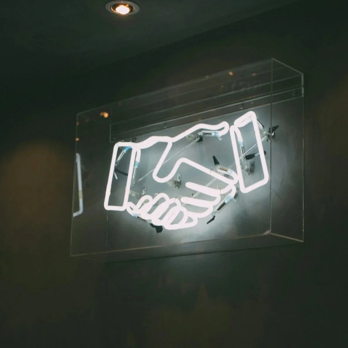 Neon sign of two hands shaking, displayed inside a clear acrylic box against a dark wall.
